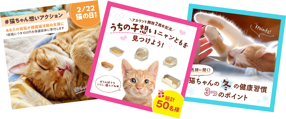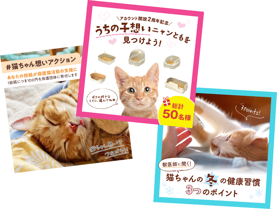 ニャンともではInstagramで、猫ちゃんとの暮らしに役立つ情報を日々配信中!フォローしてくれた「ニャン友」のみんなには、新商品モニターやプレゼントも。ぜひチェックしてね!
