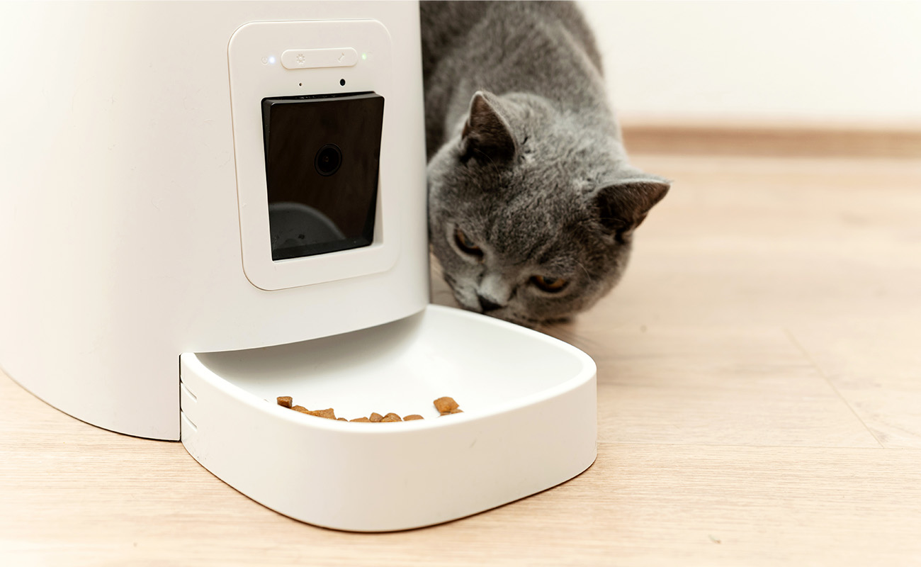フードをあげる時間と量を設定できる自動給餌器は、留守番中の食事に便利。