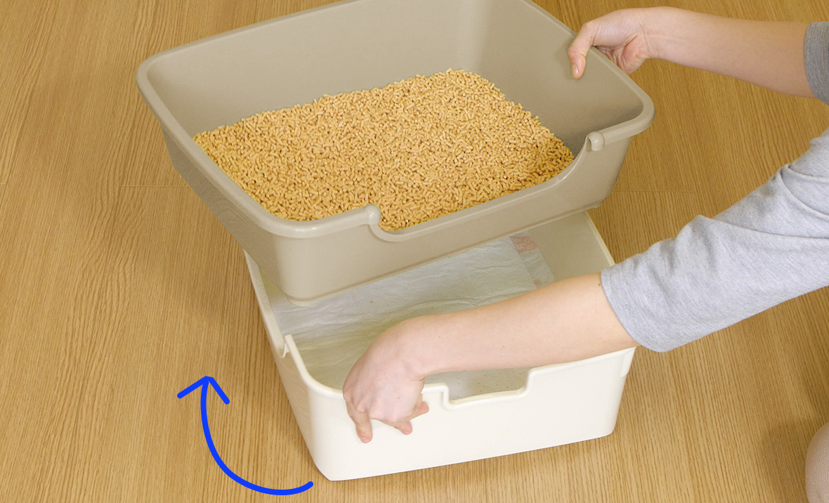 スノコを持ち上げ、左右に軽く振って、細かなチップを振るい落として、使用済みのシートを取り出してください。