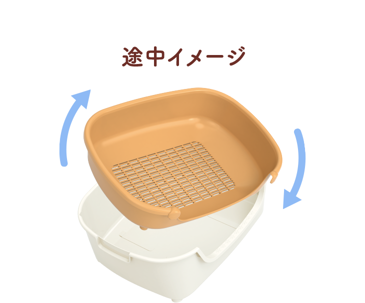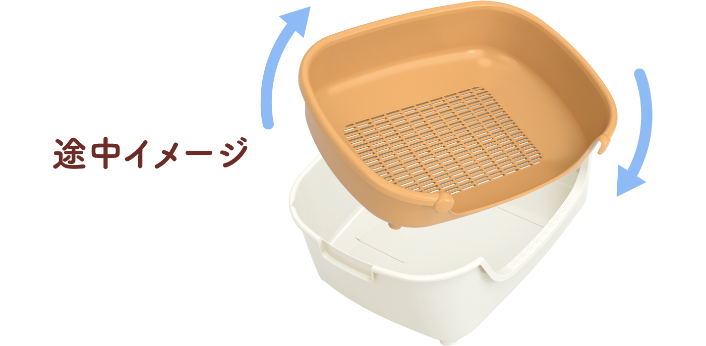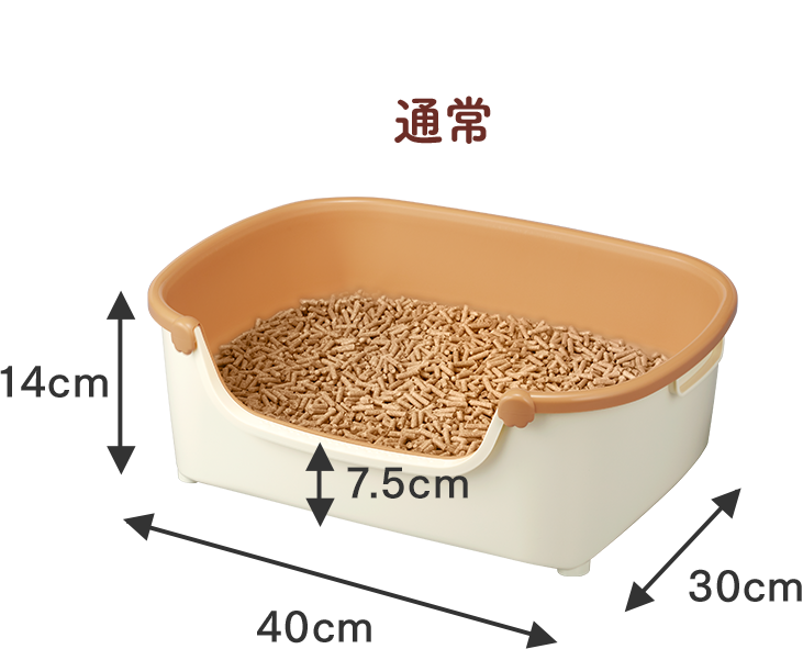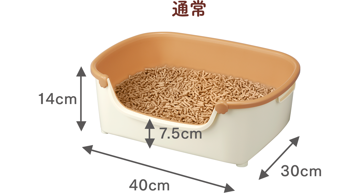 子猫が出入りしやすい7.5cmの低い入口です。トレーの足が四隅に配置されているので、5kgの猫ちゃんが乗ってもぐらつきません。 トレー上部を反転してセットすれば、トレーの壁(入口)の高さが変えられ、チップの飛び散り防止にもなります。