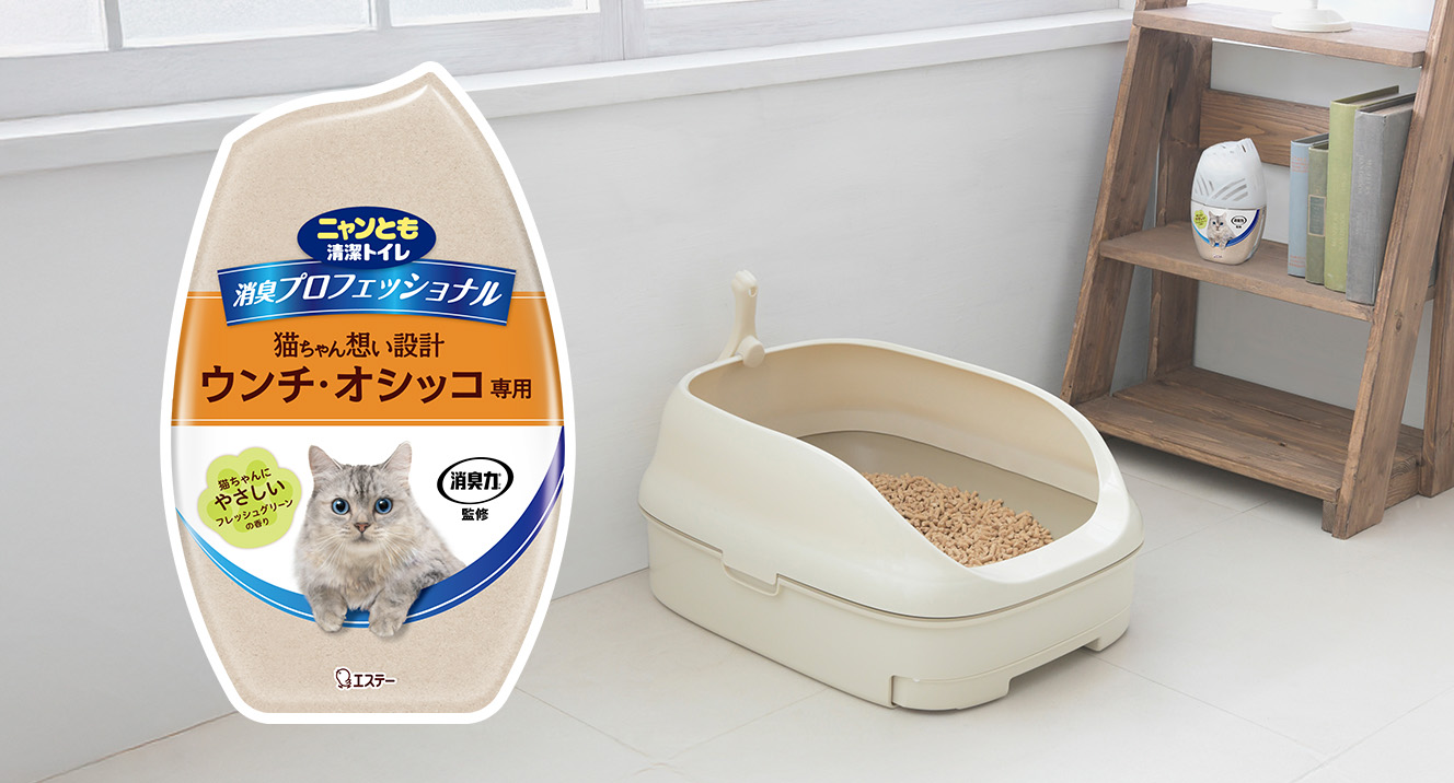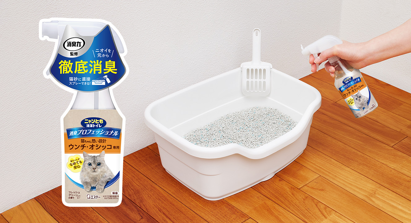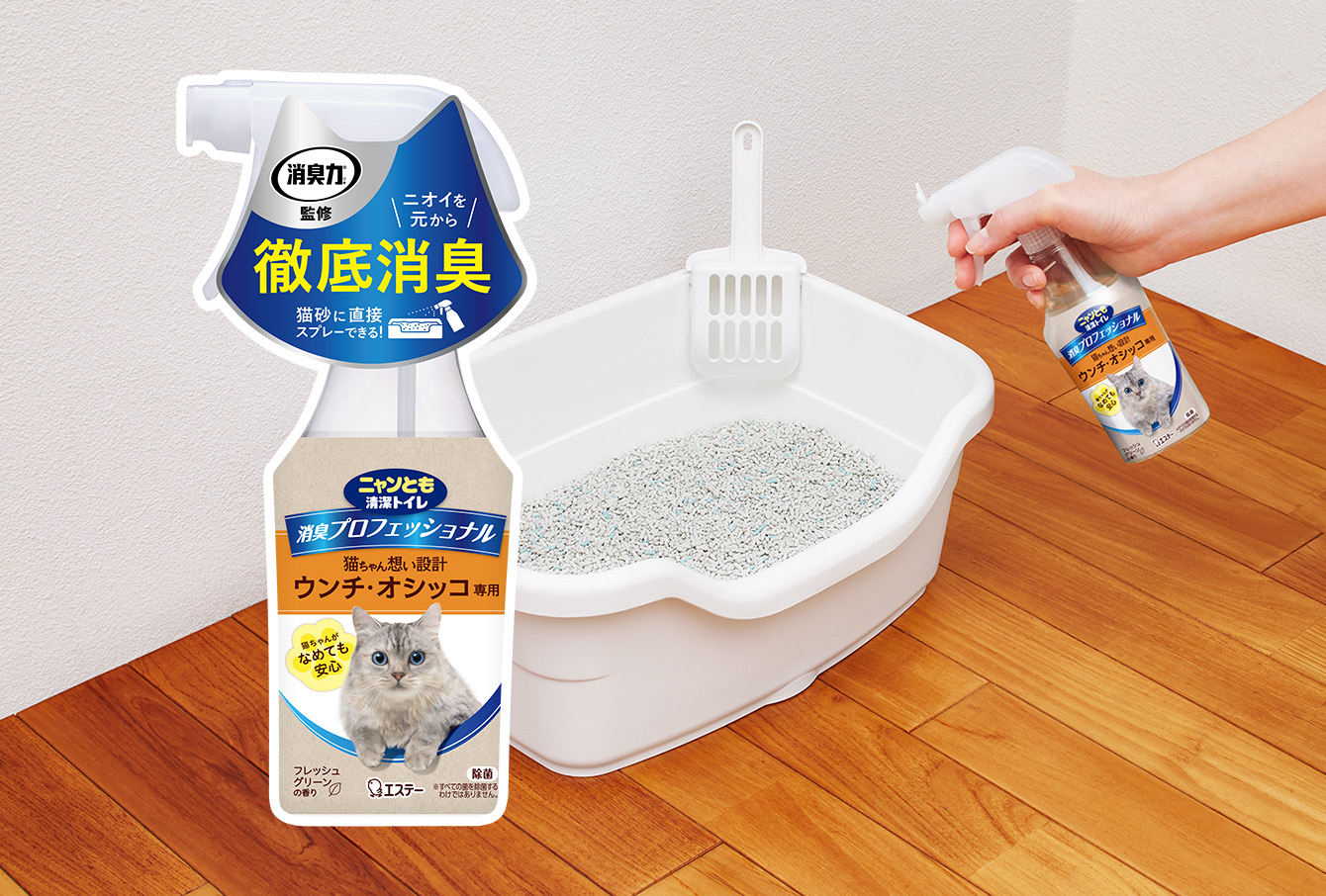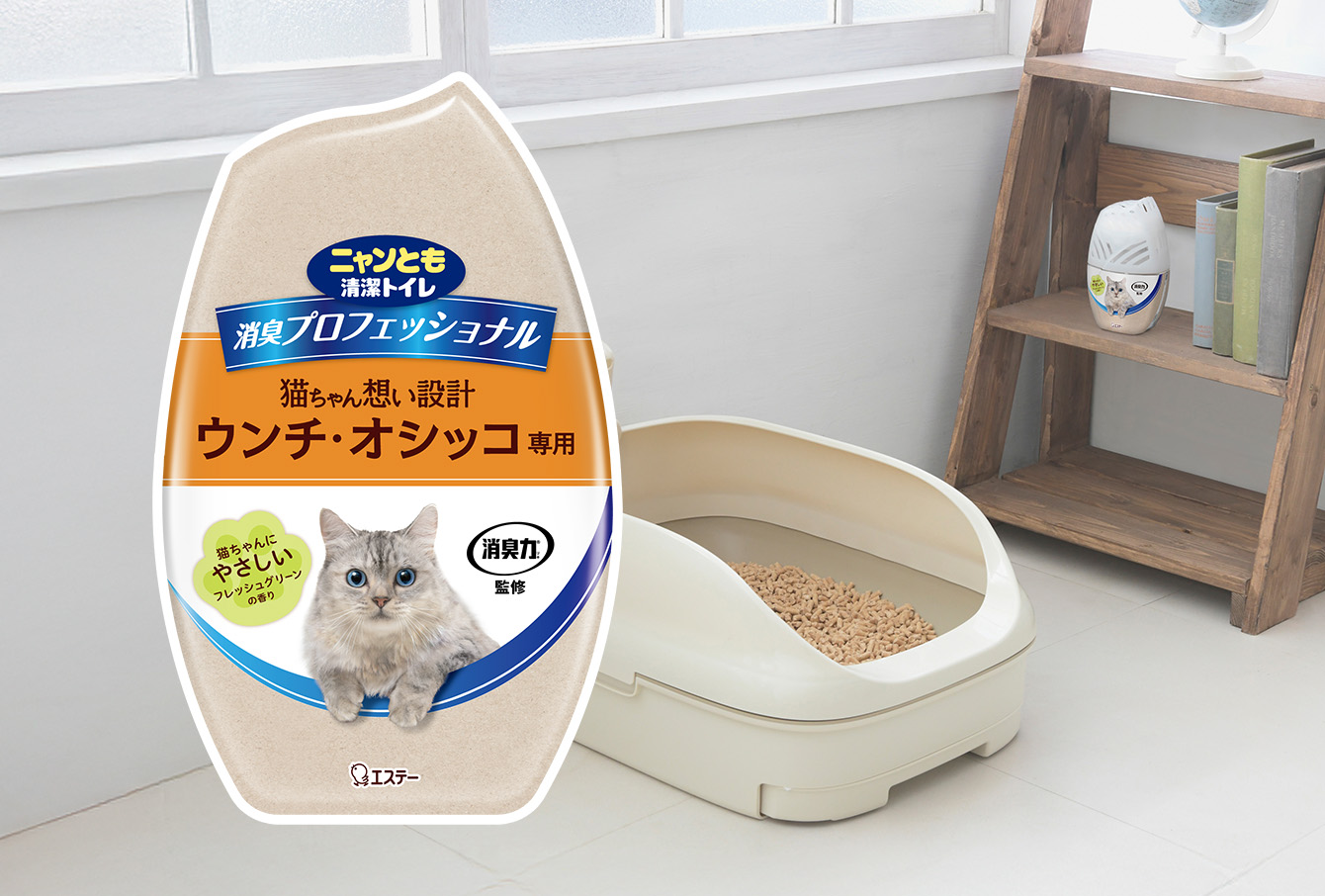 「エステーペット実感消臭」スプレー(本体・つめかえ)と置き型は、『エステーペット実感消臭』から『ニャンとも清潔トイレ 消臭プロフェッショナル』ブランドに生まれ変わりました。